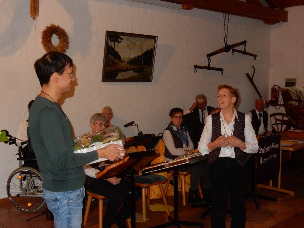 Gemütlicher Nachmittag im Saal des Mergnerhofs; Dr. Adrian Roßner berichtet über Brauchtum von Erntedank bis zu den Rauhnächten, begleitet von der Instrumentalgruppe SaitenKlar.